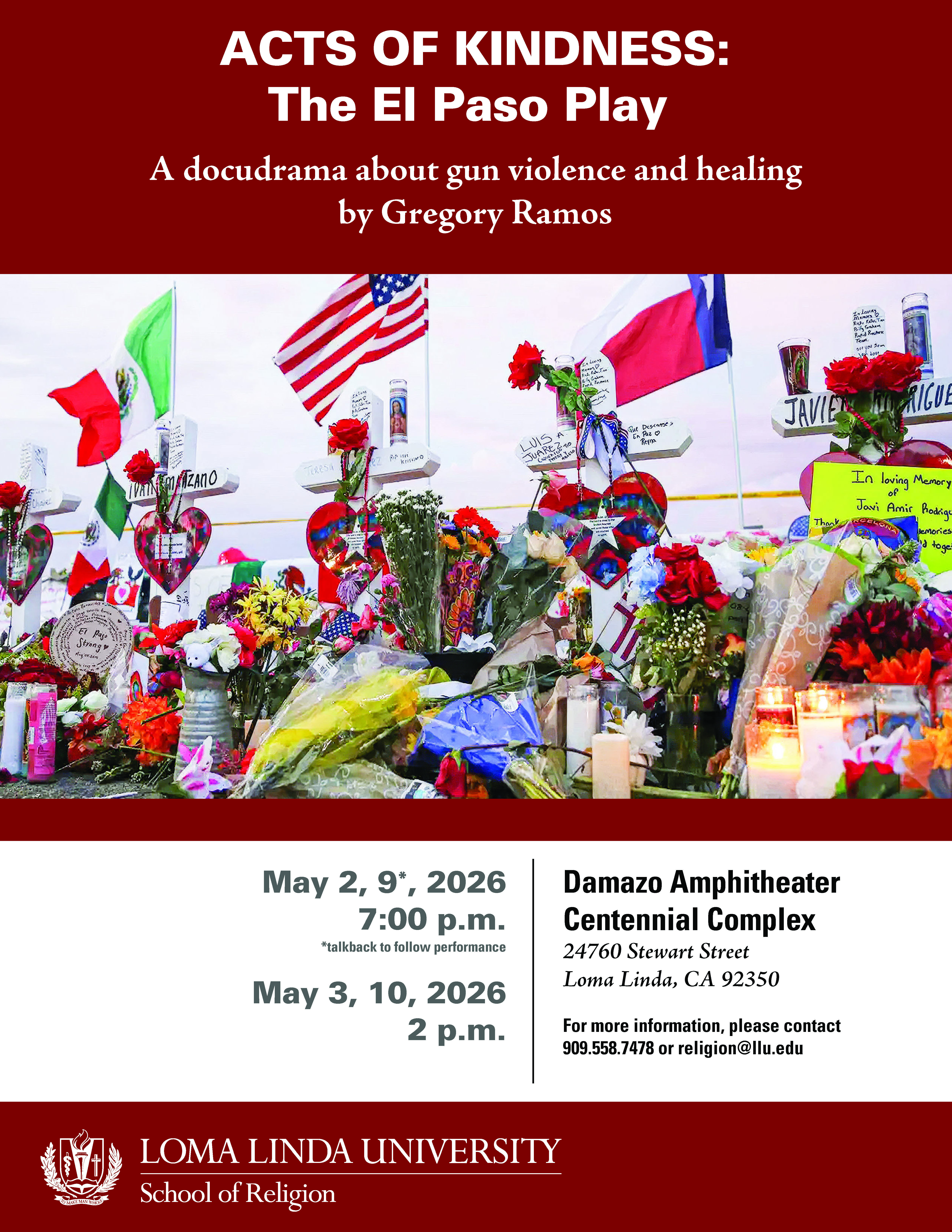 Act of Kindness is a docudrama written by Gregory Ramos, In August of 2019, a man armed with an AK-47 rifle began firing at innocent victims in the parking lot and inside a Walmart store located in El Paso, TX. A total of 23 victims were lost in the massacre, and scores of others were injured. At its core, Acts of Kindness: The El Paso Play is an exploration of grief, survival, and hope. Co-produced by Dr. Kenneth R. Wright and Otinelis Iancu, and co-produced and directed by Brady Greer Huffman. Sponsored by the LLU Humanities Program.